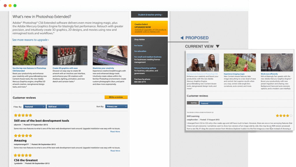 UGC can be a powerful tool, and customer ratings & reviews continue to be a dominant player in the UGC landscape. In this case, Adobe presented with the ask to assess their existing ratings & reviews implementation, while including a few options to incorporate ratings & reviews in their website testing plan.