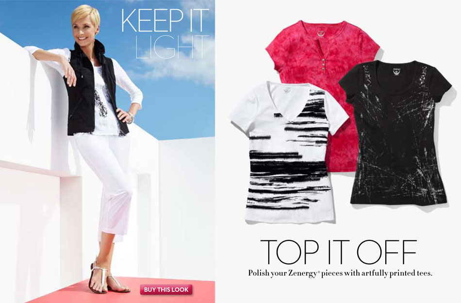 Zenergy is a line based on making casual wear chic, so the foundation of the collection tends toward black and white accented by pieces providing thoughtful pops of color. The direction was chosen to play up this aspect of the line by using the environment as a color pop (blue skies, color-blocked set), while also inspiring customers to get out and about while leaving the old t-shirt at home.